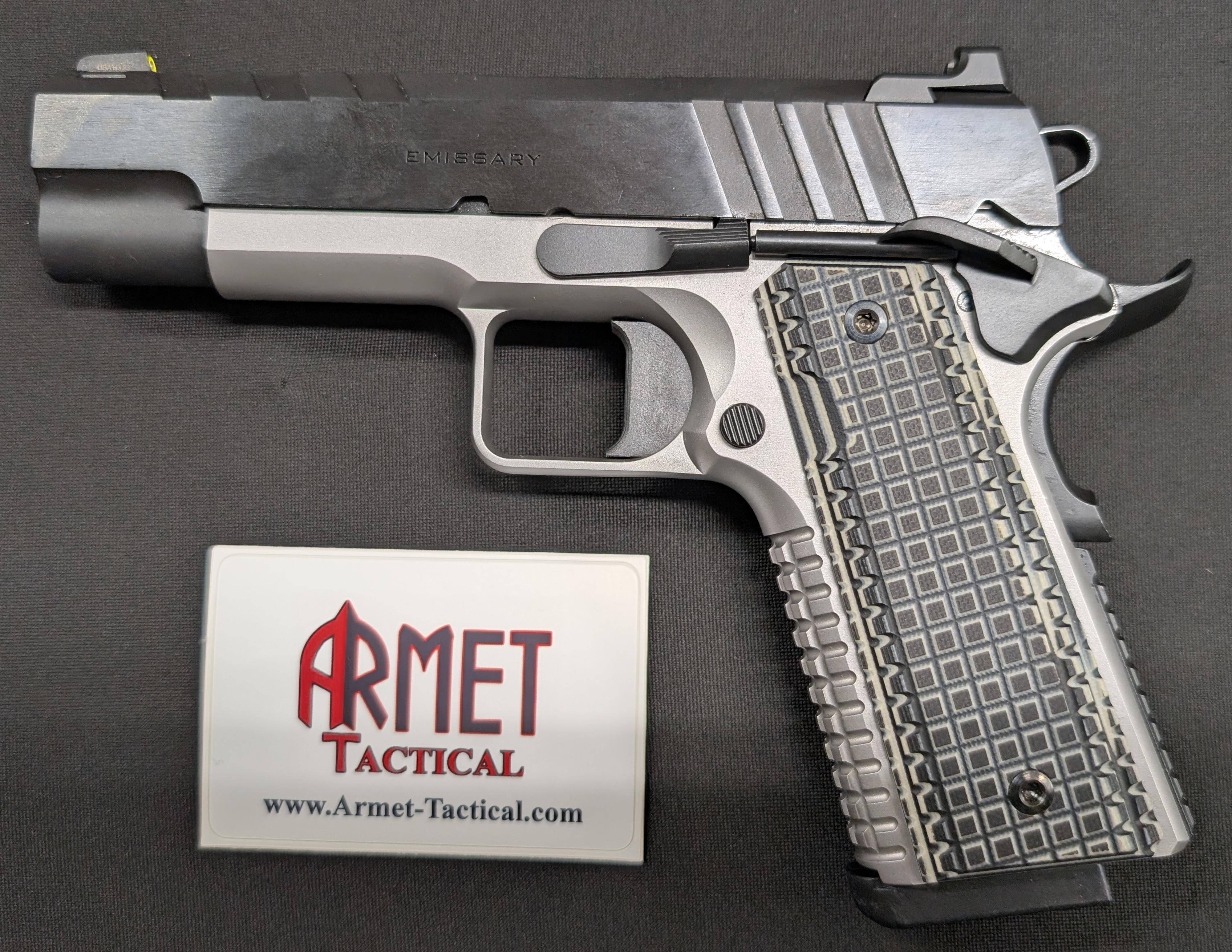 Combining compact dimensions with qualities inspired by custom-grade 1911 pistols, the Emissary 4.25” in .45 ACP is ready for everyday carry. Its Tri-Top slide features light-diffusing 40 line-per-inch serrations along the sighting plane, and a heavy-profile forged stainless steel bull barrel ensures maximum accuracy. With a forged hot salt blued slide and forged stainless steel frame with a squared trigger guard and grenade-pattern checkering, you get a pistol ready for display or defense.