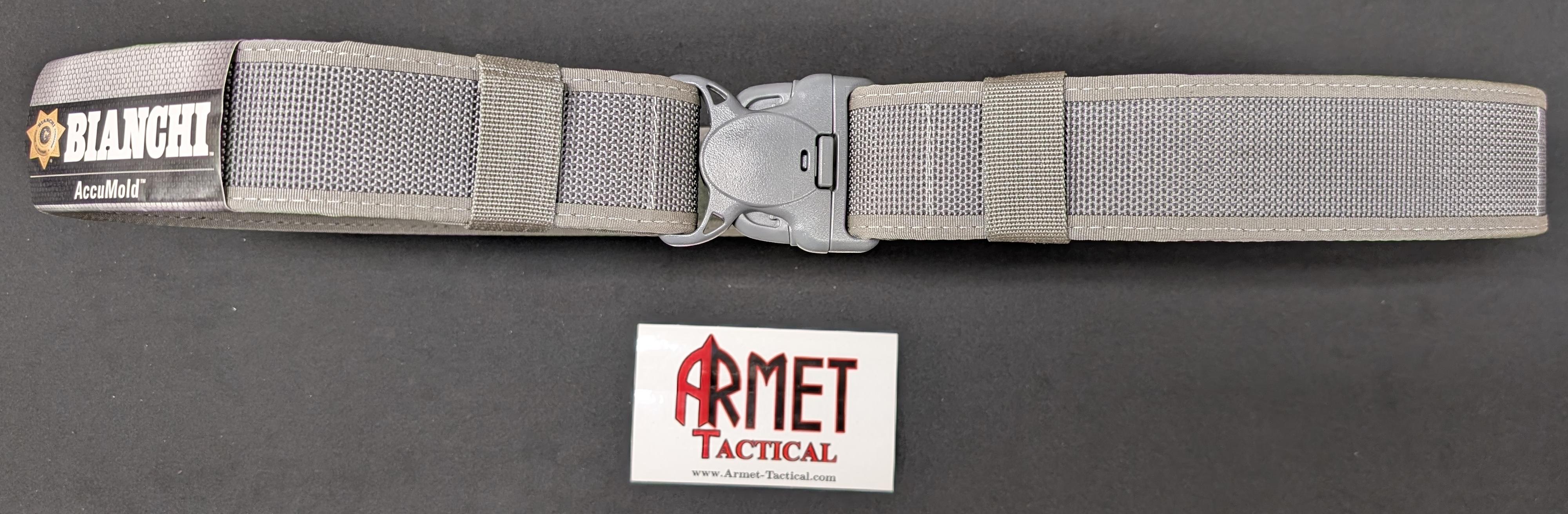 The Bianchi AccuMold Duty Belt is designed for durability and support, featuring a 5-part laminate construction with a ballistic weave exterior and polymer stiffener. Its CopLok™ buckle provides a 3-point release for secure fastening. This belt is ideal for law enforcement, offering easy on/off hook-and-loop closure and compatibility with AccuMold holsters and accessories.